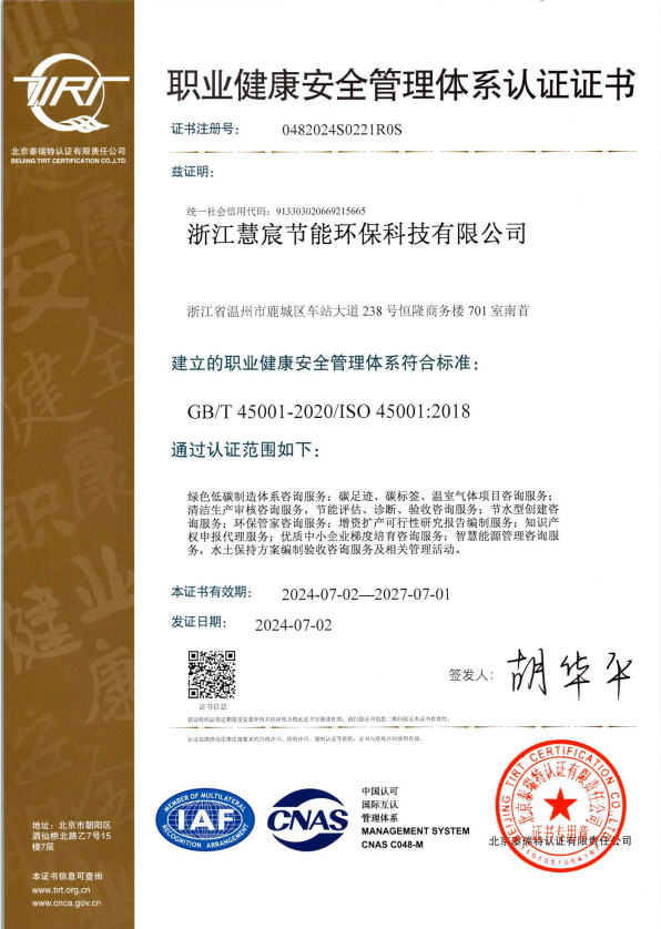 职业健康安全管理体系认证证书