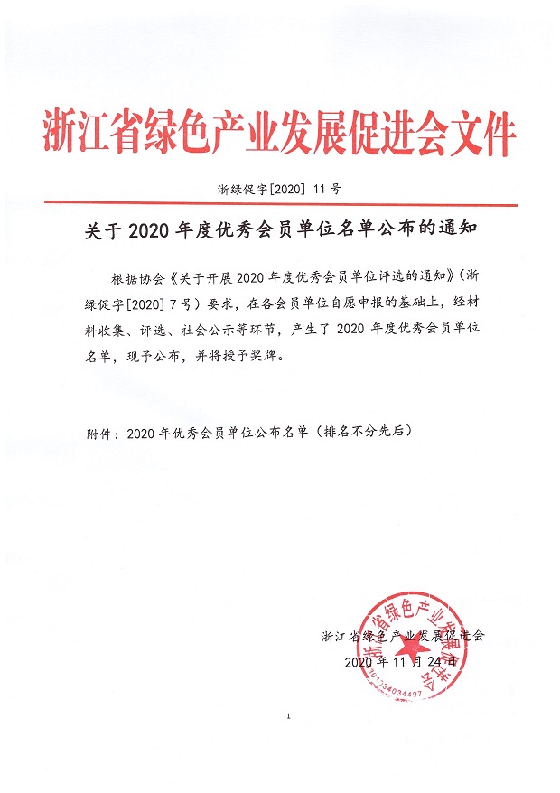 热烈祝贺我公司荣获浙江省绿色产业发展促进会2020年度优秀会员单位